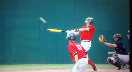And speaking of action. In the third game of the tourney, Josh stepped up to the plate. Apparently lightning can indeed strike twice, because with two strikes, our youngest kid hit a bomb over the center field fence. Homerun. And thanks to the Samsung Camera, I got the shot just as the bat made contact with the ball.