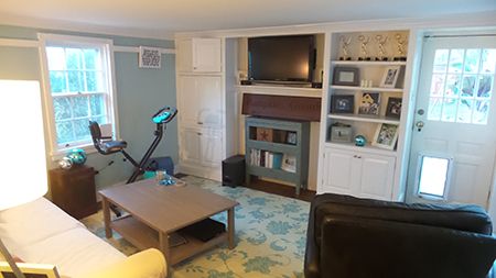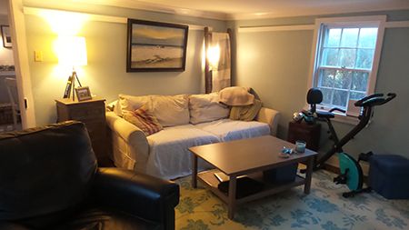 When we moved in we immediately had to gut and redo the small mud room bathroom and downstairs to make it livable for my cousin. We made it super beachy and I'm so proud of that pretty blue bathroom.