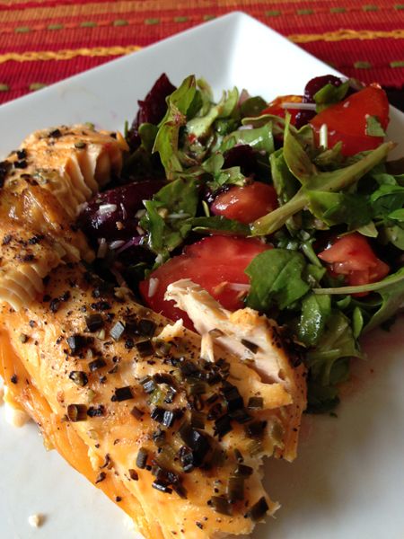 Drizzle salmon with olive oil. Sprinkle with chives, salt & pepper. Bake @ 375 for 20 minutes. I prefer my salmon cooked well done. Adjust the cooking time to your desired temperature. Served with Arugula & Beet salad.