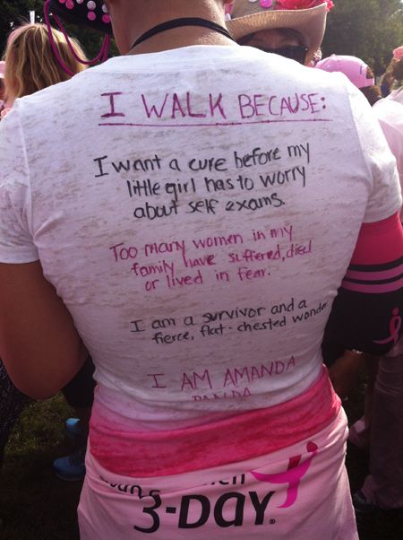 Now to Amanda. There was a poster that came with the 3-Day registration packet that had a picture of two women, fists in the air with the slogan “I found my inspiration at mile 37.” I found mine at 52. Carolyn & I found ourselves behind this t-shirt on the 3rd Day, 8 miles to go.