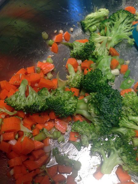 Heat 1- 2 tablespoons sesame oil in a wok or large saute pan. Add any veggies you like. Here, I'm using 6 scallions, garlic, 1/2 head of broccoli, and 2 carrots. I have also used bell peppers and asparagus with good results. Saute for 5 mins.