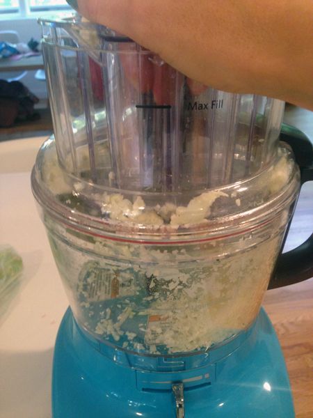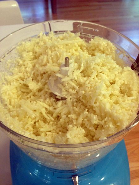 Shred one head of cauliflower. I guess you could use a hand grater, but I use my KitchenAid food processor. You want the processed cauliflower to look like a combination of white rice and shredded cheese.