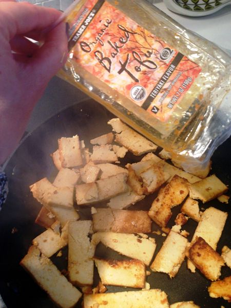 In the meantime, in a separate skillet cook your favorite protein. Here, I sautéed tofu in sesame oil until brown. You could also use pork, beef, chicken or shrimp.