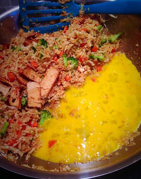 Add your protein to the veggies and stir in 4 tablespoons of soy sauce. I use the lower sodium version. Saute for a minute and then push all of the veggies to the side of the pan. Pour 2-3 scrambled eggs on the other side of the pan and cook, stirring, until set.