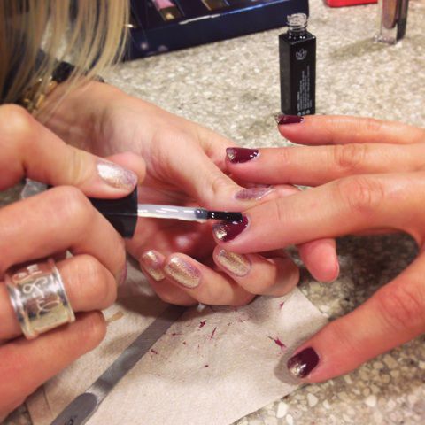 After letting them dry, she then created a beautiful ombre look by using “Love,” a golden pearl shade with fuchsia micro-glitter. The trick with the ombre look is to apply a good amount to the very tip of the nail, and as you make your way down to the middle of the nail, start lightly dabbing. This will give it the fading feel you will see in the final product!