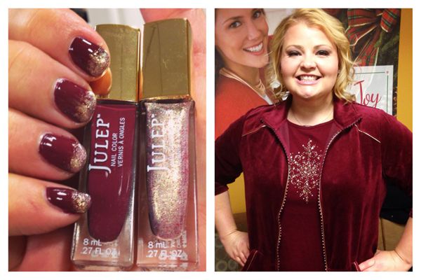 Our first “MistleTOE Monday,” comes from an idea sparked by our very own Angel Smedley from Quacker Factory! After seeing a couple of my “Mani Monday” how-to’s, Angel asked if we could collaborate and come up with a fun manicure to match one of her favorite pieces for the holidays from Quacker Factory. {CLICK: To shop the Quacker Factory Velour Jacket and Winter T-shirt}