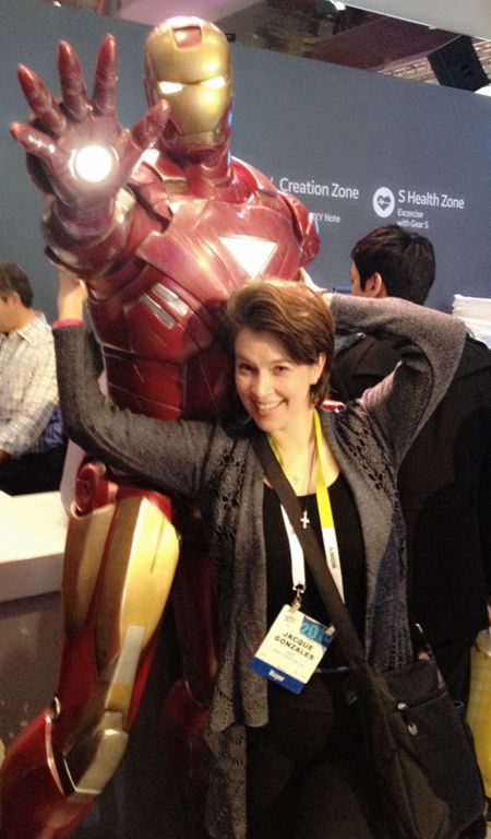 {Program Host Jacque Gonzales is well-protected by Iron Man!}