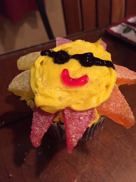 Put vanilla icing in a bowl and add a few drops of yellow food die until the desired color of yellow is created. For brighter yellow use a gel food color instead of liquid. Frost the cupcakes. Take the gumdrops, using a sharp knife, cut them in half and then cut out small triangles. Use the decorating gel for the sunglasses and smile. Viola! A happy cupcake!