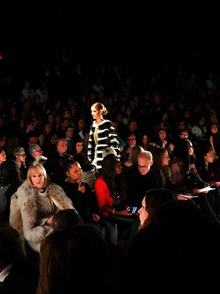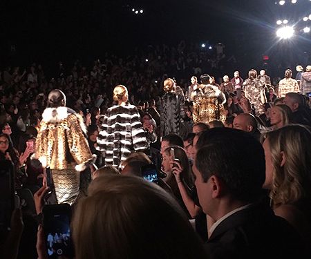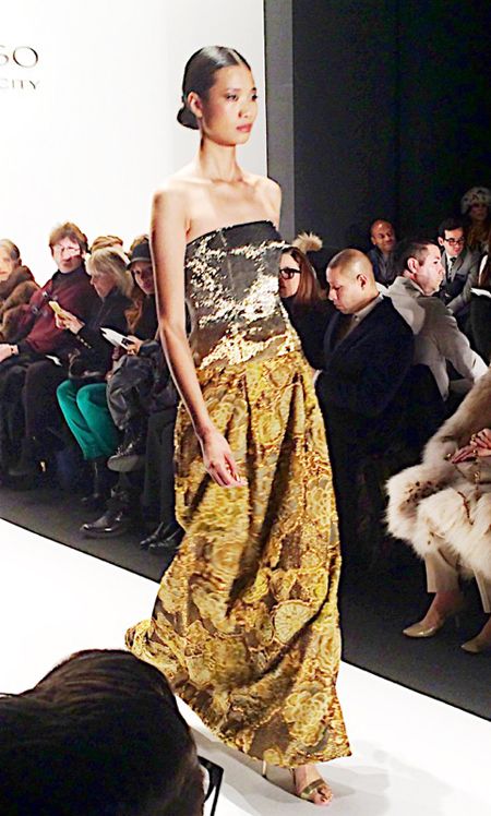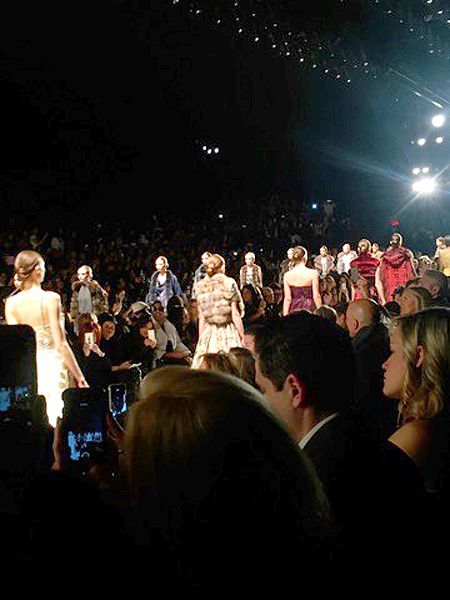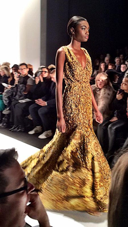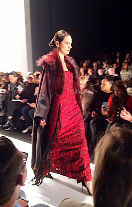 Everyone looked amazing and it was so much fun seeing everyone outside of work. We made plans to grab lunch after the show before we all took our seats. The program explained the inspiration for this collection as the glamorous jet setting women of the 70’s, a la Jackie O. and Studio 54. Dennis sent down the runway a chic and lux collection of 70’s inspired jumpsuits, palazzo pants and halter tops. The looks were opulent and elegant yet modern. The color palette featured warm golds, black, white and grey to brick red, plum and the color of the year, marsala. My favorite pieces were the extravagant ball gowns topped with fur boleros. If I ever attend a red carpet event I know who to call!