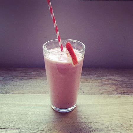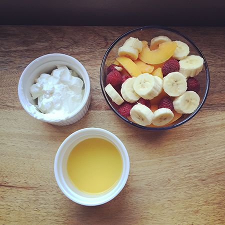 Put all ingredients in the blender and process on high speed until smooth (less than a minute). I usually pulse the blender mixture a few times before turning it on high. You can add granola or protein powder to the mixture and have it as your total breakfast on the go! Try adding different fruits, fruit juices, skim milk, or yogurt flavors...even sorbet...until it's exactly the way you like!