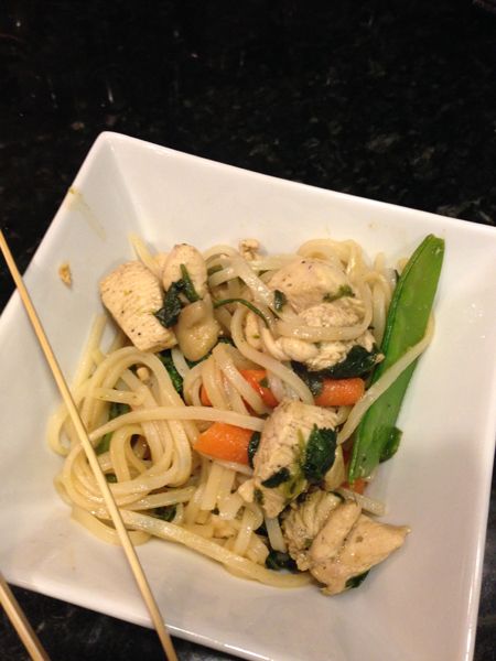 Bring 4 cups of water to a boil. Cook noodles according to package directions. Meanwhile, season the chicken with salt & pepper. Cook the chicken in a large skillet with veg. oil & sesame oil. Set aside. Add broccoli, spinach, carrots, mushrooms, scallions, cook to desired tenderness. (softened but not mushy for me)