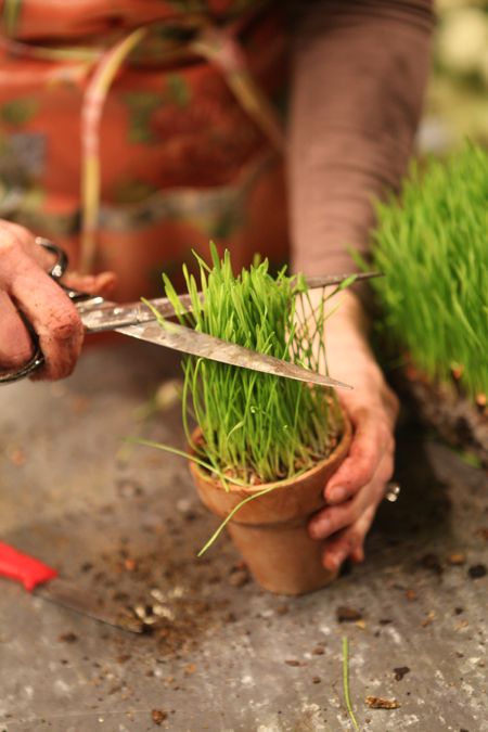 I have sowed my own flats of wheat grass with seeds and soil – grass will grow within two weeks or so. But you can also purchase flats from your local garden centers.