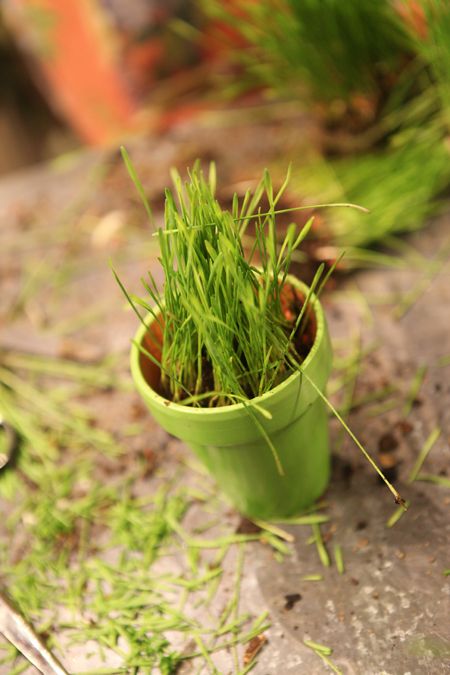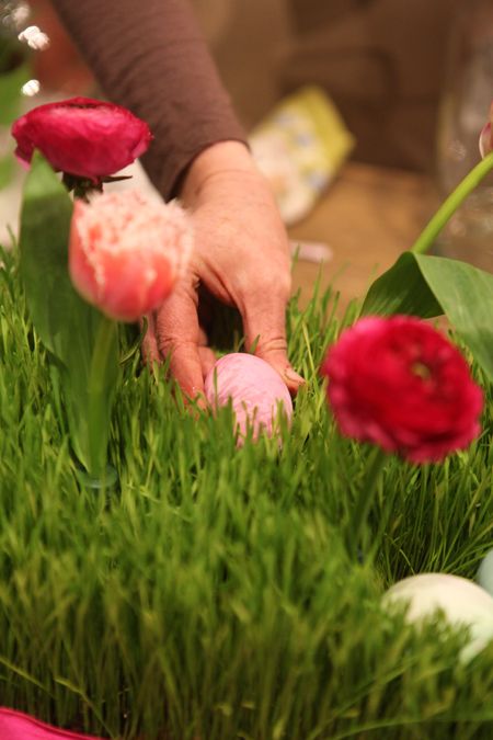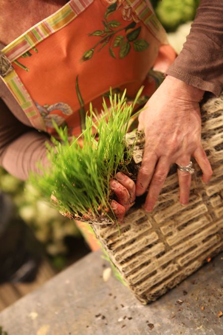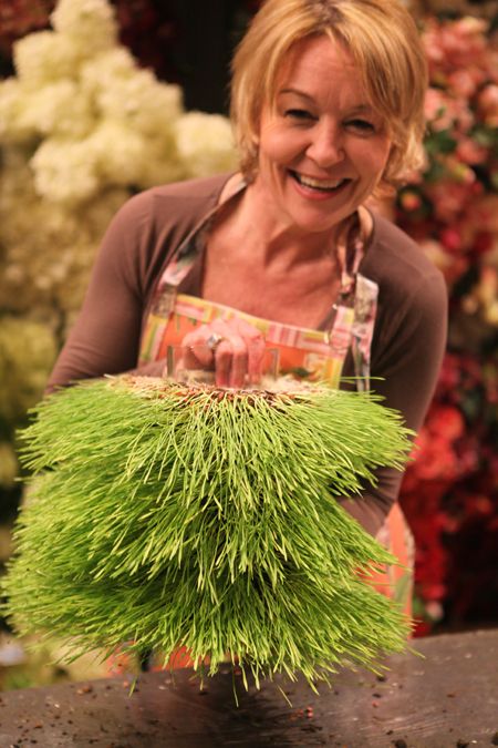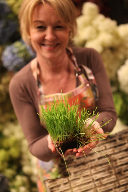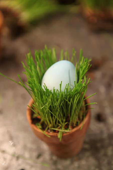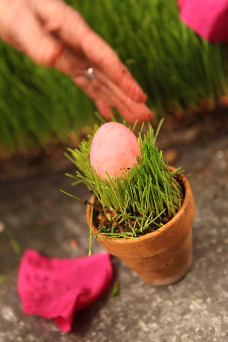 Wheat grass isn't just for juicing anymore! I love making centerpieces, arrangements and party favors with wheat grass. Since wheat grass has strong roots and is bound tightly, it is wonderful to use in many applications. With a few inexpensive supplies – ribbons, eggs, and flowers – you can make plush, green, spring showstoppers!