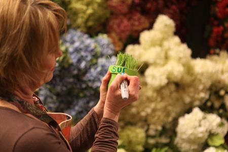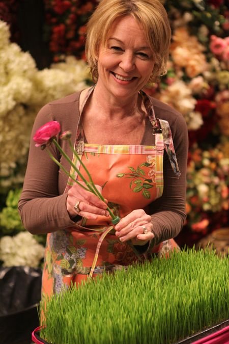 This centerpiece begins with a flat of grass. I wrap a colorful ribbon around the base to cover the “mechanics.” I took tulips and ranunculus – some of my favorite spring flowers – and placed them in water tubes. This will not only keep the flowers fresh longer, but should you want to switch-out the flowers it’s so easy!