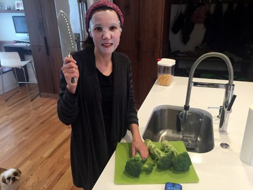 I have been using the Tatcha Luminous Deep Hydration Masks for over a year now. I was so happy when we finally started carrying them on QVC . They are my little secret for when I want my skin to look firm and super hydrated. Plus they have the added bonus of really freaking out my entire family. Here I am cooking dinner before heading to work. I’m channeling my inner Michael Myers.