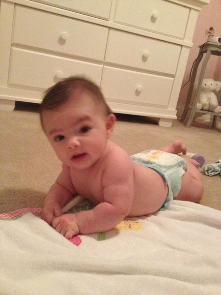 Look what I can do! Someone loves rolling onto her belly now that she discovered how. The propping herself up on her elbows just started today. You weren't lying when you said they get big, fast:)