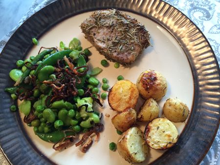 Serve pork whole or cut against grain into 1/4 inch slices. Divide pork, potatoes and pea salad evenly between 2 plates and enjoy.