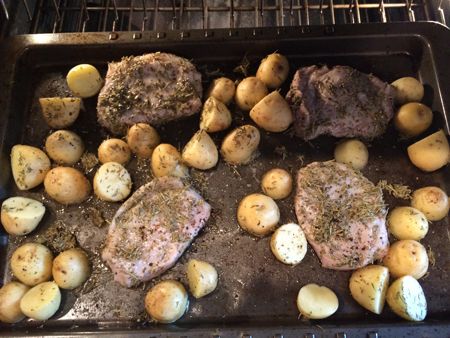 Place pork and potatoes on baking sheet and pour over mustard mixture. Toss to coat. Arrange cut-side down.