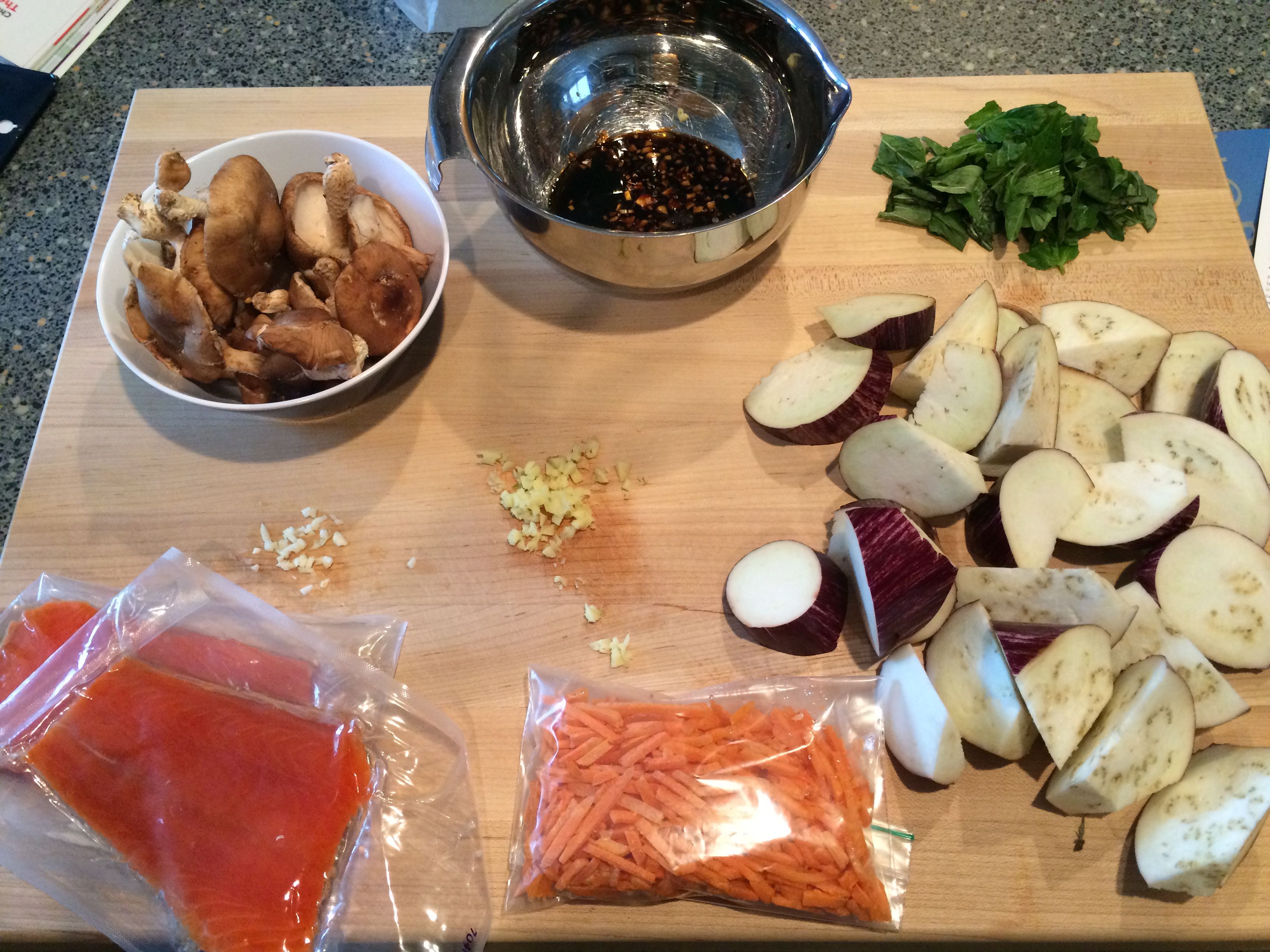 In medium bowl, toss carrots, mushrooms and remaining garlic, ginger and sesame oil. Season with salt and pepper. Set aside.