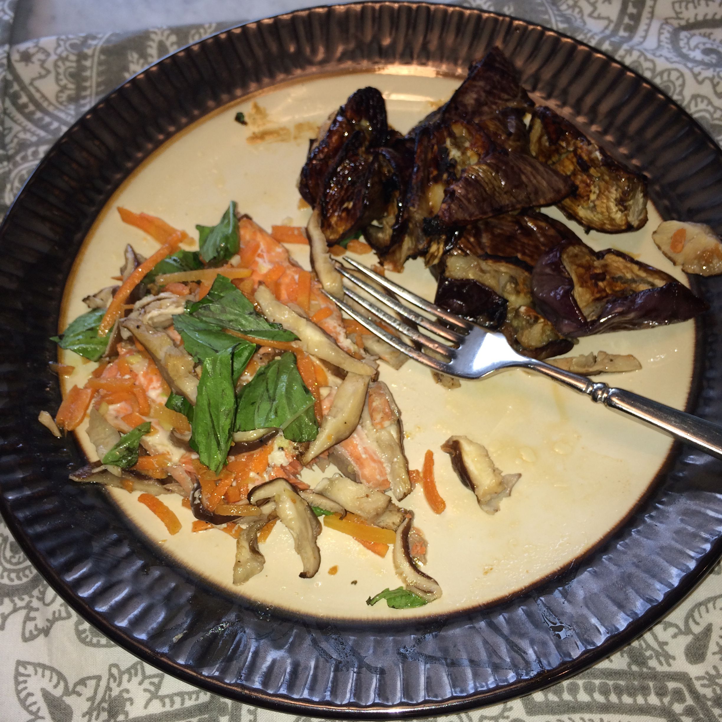 Remove cedar wraps from water and lay flat. Cut twine into two, 6-8 inch pieces. Place salmon in center of wraps and dot evenly with butter or ghee. Spoon over slaw. Carefully wrap cedar over salmon and slaw (cedar edges may just barely touch, they don’t need to close completely around the salmon) and secure with twine. Add cedar wraps to same baking sheet as eggplant.